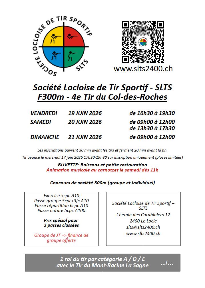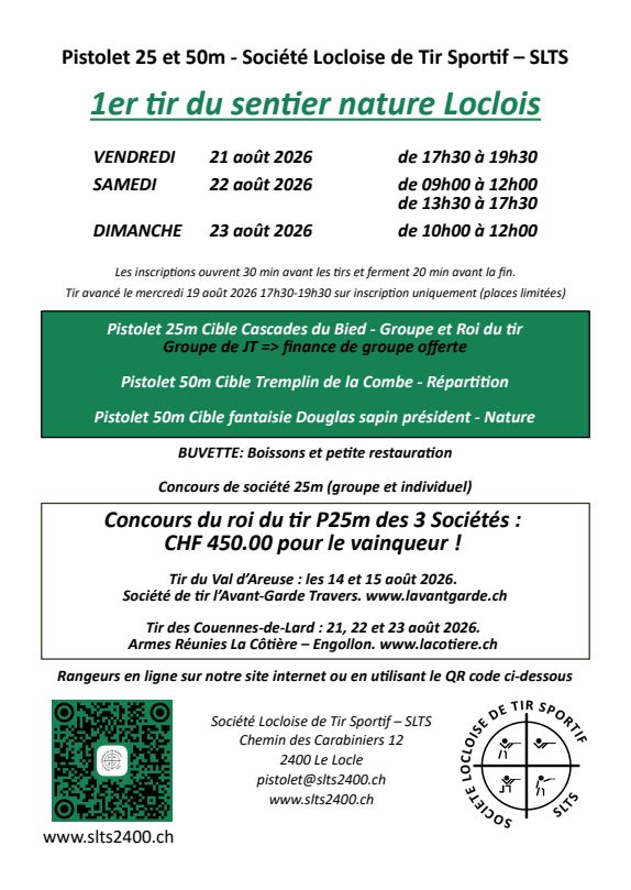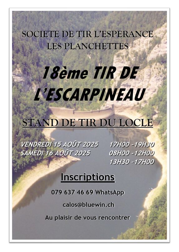 Tirs obligatoires:Mercredi 13 août 2025: 17h30 - 19h30Samedi 23 août 2025: 09h00 - 12h00
